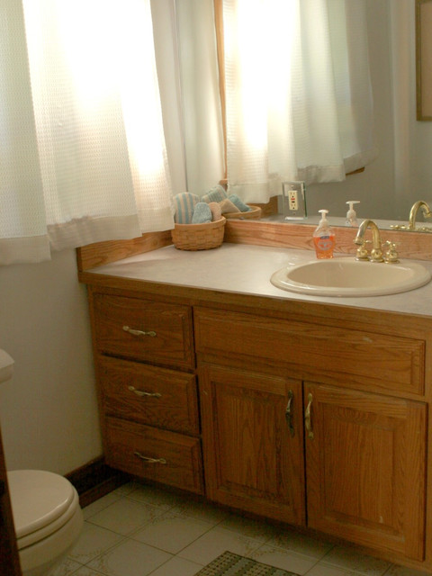 My plan for this update was to do it as cost-effectively as possible. I planned to keep the vanity and paint it, lay wood-look LVP over the linoleum, paint the walls, replace the toilet, update the lights, and update the counters/sink.