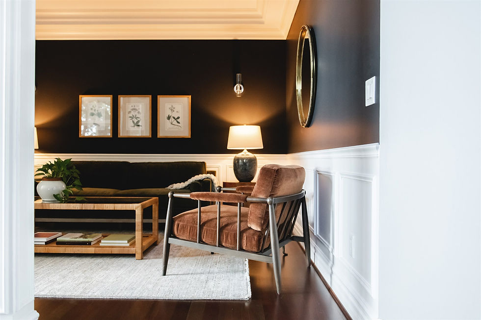 I love the warmth that the burl wood side tables and the woven coffee table bring into such a dark space. Whenever you go dark and moody, you have to balance out the coolness with some warm elements like wood or natural textures so it doesn't feel cold:
